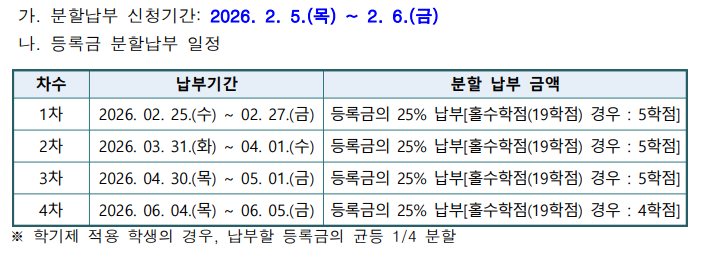 2026학년도 1학기 학부 등록금 분할납부제 실시 안내